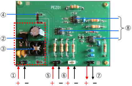 圧電素子1個の場合は、入力Eの+と−をショートピンで短絡